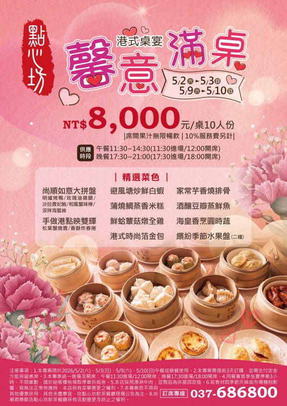 4. 本專案恕不得與其他優惠併用,其他未盡事宜,依點心坊飲茶餐廳現場公告為主。